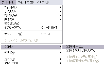 ●タイトルに画像を読み込む● PhotoshopやIllustratorなどで作成したロゴや画像を、タイトルの中に配置することができます。 ![]() ロゴを挿入の場合は、ひとつのオブジェクトとして読み込まれます。 テキストの中に埋め込みたい場合は、埋め込みたい部分にカーソルを置き、ロゴをテキストに挿入を選択します。