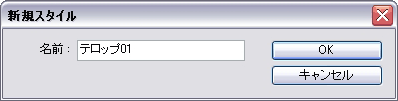 グラフィックの種類は、ペンツールや図形ツールで描いた場合に出てきますが、 ここで他の形状を選択すると、形状が変わってしまうので、注意しましょう。 ![]() ●スタイルのプリセットを作成する● 作成したスタイルからプリセットを作ることができます。 スタイルの設定された文字を選択し、新規スタイル作成ボタンを押します。 ![]() スタイル名を付けてOKボタンを押します。 ![]() ●タイトルをセーフーマージン内に収める● テレビ用のムービーの場合は、映像の端の部分が切られてしまいます。 そのため、重要な部分は、画面の端に寄り過ぎないようにします。 折り返しを使うと、文字がタイトルセーフマージンからはみ出したときに、自動的に折り返してくれます。 (タイトルセーフマージンは、プロジェクト設定で変更することができます。) ![]()