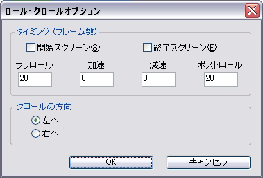 ●流れる文字の設定● スクロールするタイトルを作成するには、タイトルの種類でロールかクロールを選択し、ロール・クロールオプションのウィンドウで詳細を設定します。